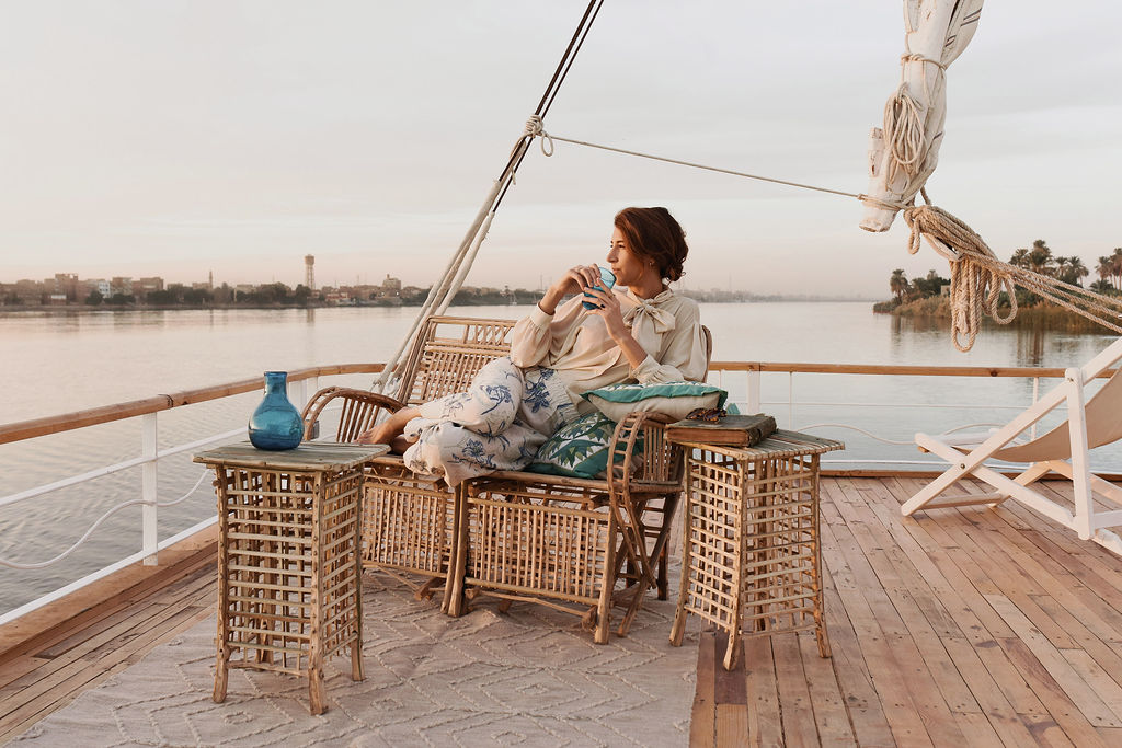 À bord de nos dahabiehs, chaque instant est pensé pour votre sérénité. Bien plus qu’un voyage, Lazuli vous invite à vivre une expérience raffinée, intime et ressourçante. De notre bar à cocktails à notre service du linge, en passant par le Spa éphémère by Sarah, nos services à bord subliment l’art du voyage lent sur le Nil.