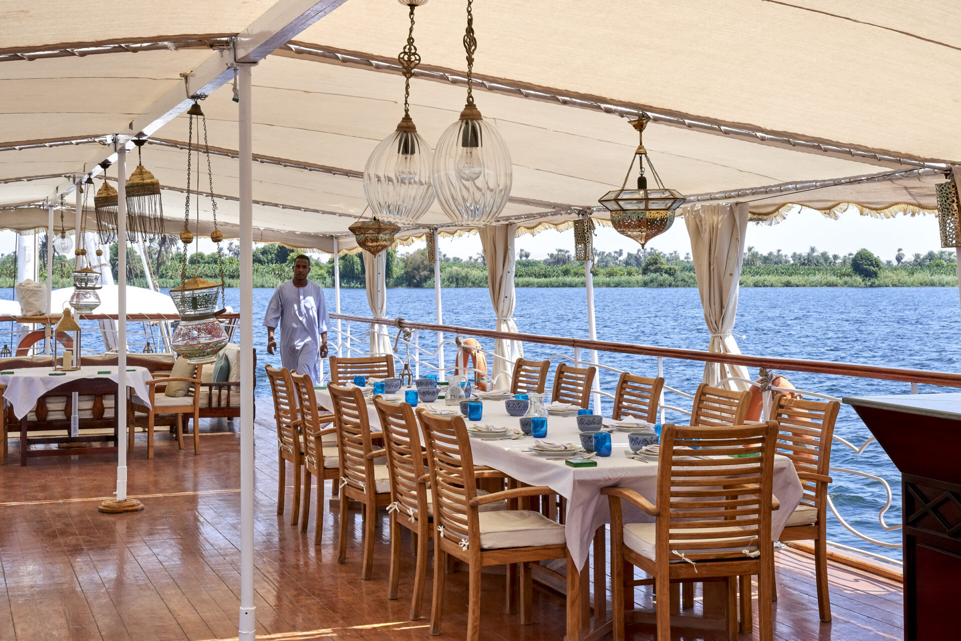 Le pont propose aussi une grande table d’hôte, des salons orientaux, des transats ou bains de soleil, et un bar à cocktails pour profiter pleinement de la navigation. Comme toutes les dahabiehs Lazulinil, Albatros est équipé de systèmes de sécurité complets et d’un équipage formé pour garantir une croisière paisible et encadrée.