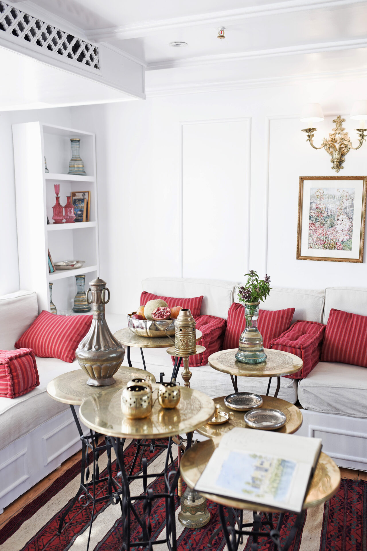 Ce qui distingue Karnak, ce sont ses grandes baies vitrées à l’arrière, qui baignent les 2 suites panoramiques de lumière naturelle et offrent une vue inégalée sur les rives du Nil. Les 8 cabines standards, décorées avec soin, adoptent un style Old English intemporel : blanc et bleu dans les chambres, rouges et framboises dans les salons et sur le pont.