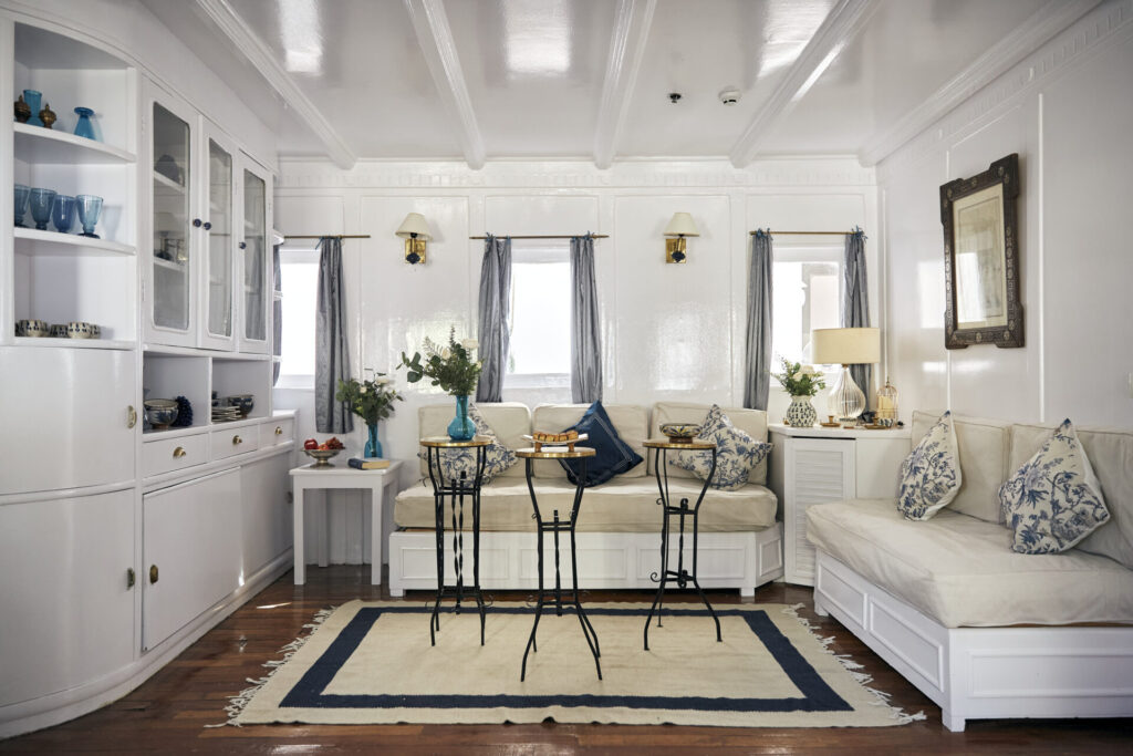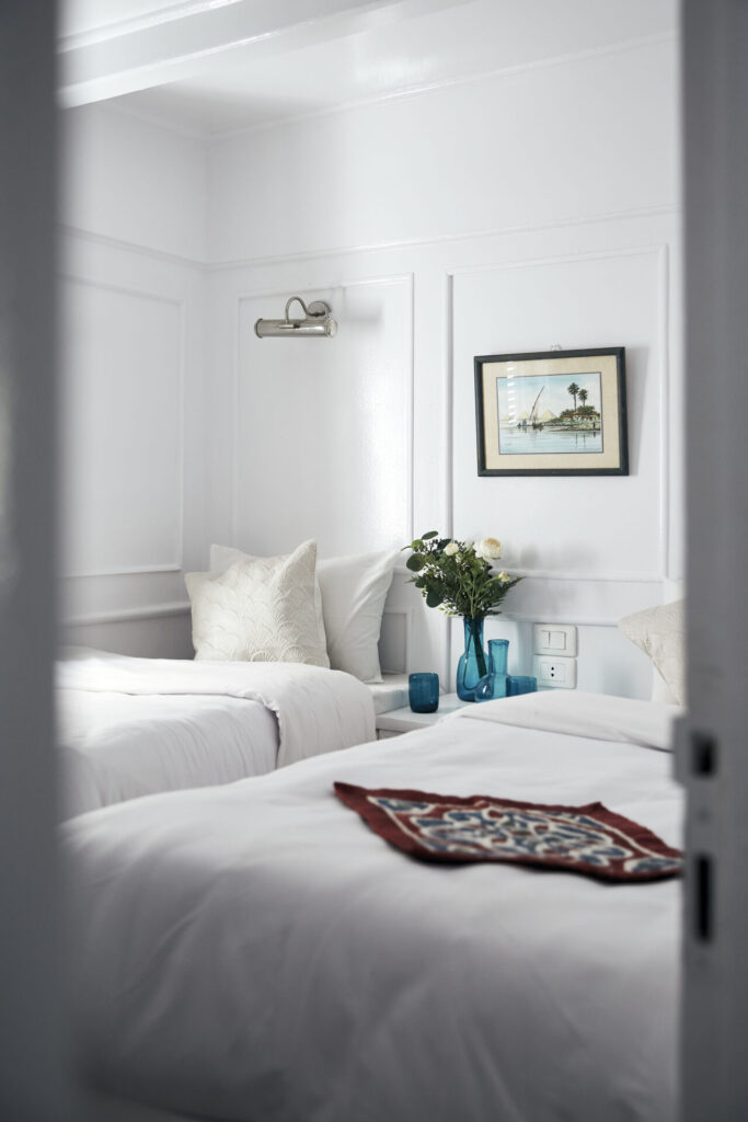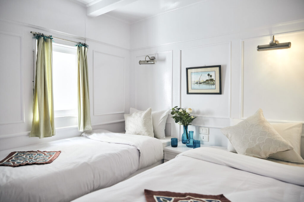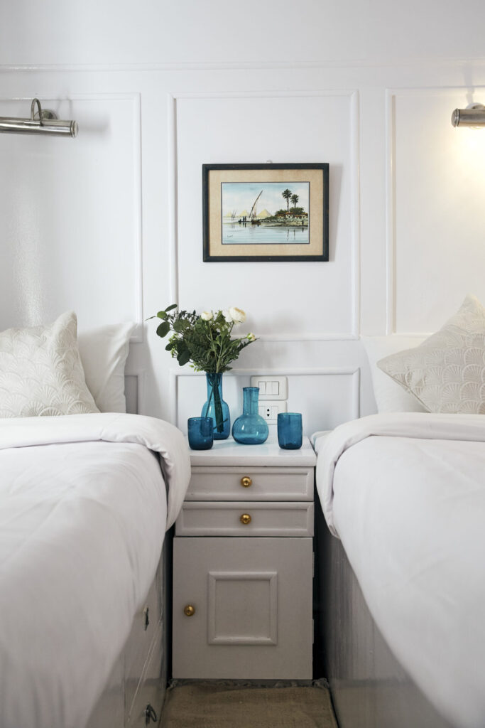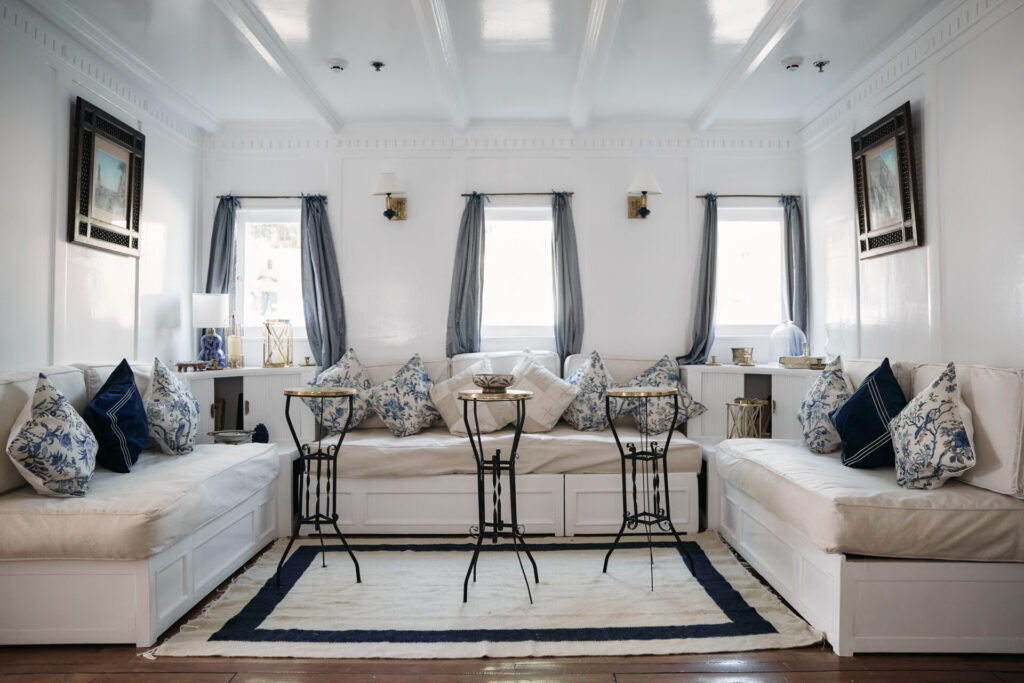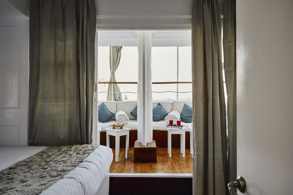 Conçu pour accueillir jusqu’à 12 passagers, il dispose de 2 suites avec balcon privé à l’arrière, idéales pour savourer le Nil en toute tranquillité, et de 4 cabines standards décorées avec soin dans un style Old English – blanc et bleu apaisants dans les chambres, rouges et framboises profonds dans les salons et sur le pont.